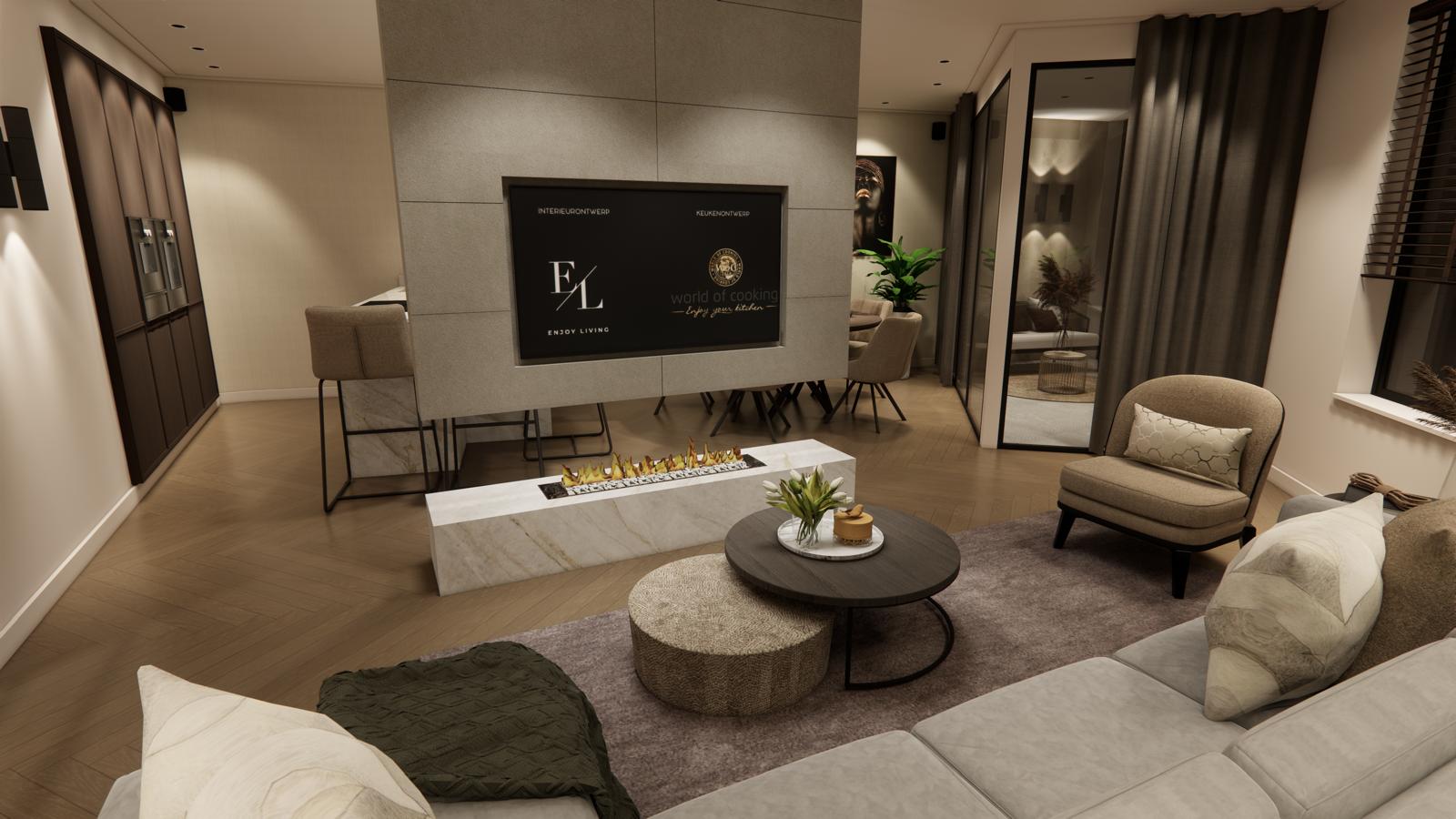 Bij het ontwerpen van deze render hebben we zorgvuldig gekeken naar de balans tussen functionaliteit, comfort en esthetiek. De keuken is volledig op maat ontworpen, met aandacht voor optimale indeling, materiaalgebruik en een rustige uitstraling binnen de ruimte. De haard met geïntegreerd tv-meubel vormt het centrale punt van de leefruimte, waarbij sfeer en praktisch gebruik perfect gecombineerd zijn.