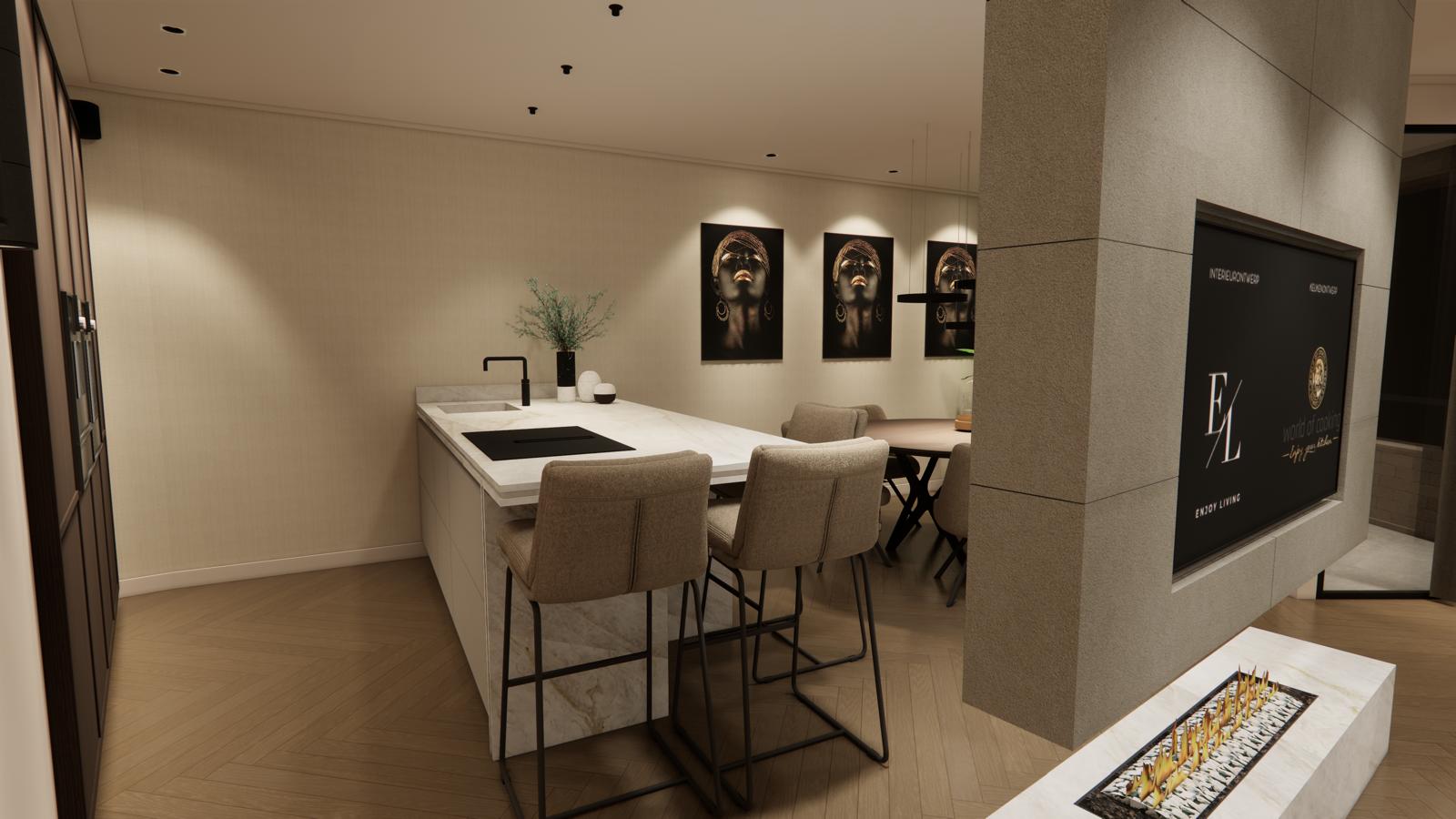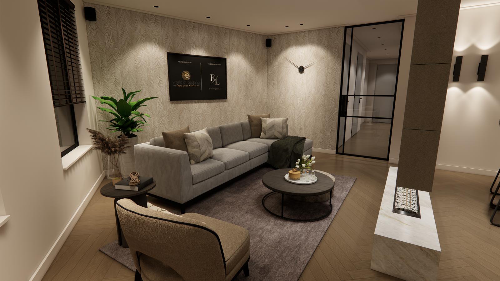 Voor dit prachtige project hebben wij de kans gekregen om een volledig uitgewerkte render te maken als impressie voor de toekomstige kopers. Deze visualisatie geeft een realistisch beeld van de sfeer, materialen en indeling van de woning. Daarnaast mochten we ook meedenken én leveren op het gebied van de keuken, de open haard met tv-meubel, de vloeren en de wandafwerking. Het resultaat is een warm, modern en stijlvol interieur dat laat zien wat er mogelijk is.